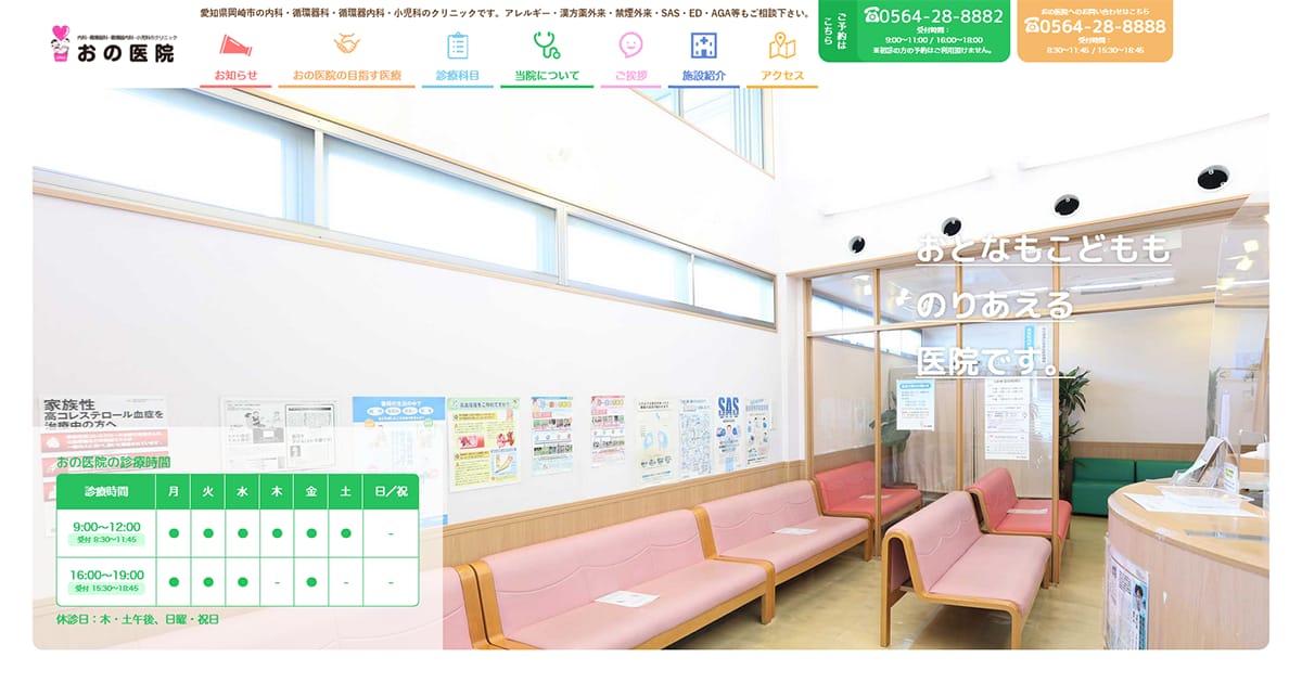 おの医院09:00~12:00, 16:00~19:00おの医院は内科・循環器内科・小児科を併設し、全館バリアフリーで成人・小児を待合から完全に棟別に配慮。岡崎で睡眠時無呼吸症候群外来も提供し地域医療と連携する優しい総合クリニック。待合室や診察室等を大人用と小児用に分離し、子どもや高齢者に配慮した設計です。料金(税込) -詳細を見る公式サイトを見る