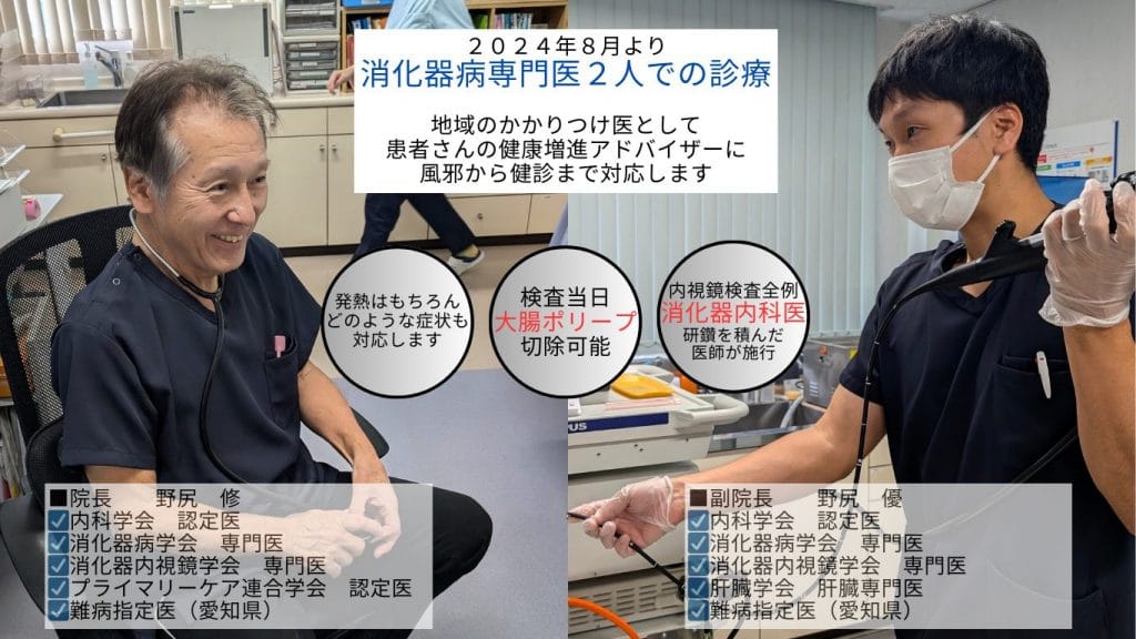 のじり内科クリニック08:30~12:00 / 16:30~19:00春日井市東神明町ののじり内科クリニックは、内視鏡のエキスパートが胃・大腸検査を担当し、苦痛を抑えた検査と睡眠時無呼吸症候群の診断強化で地域の早期発見・治療に注力します。日帰りポリープ切除や生活習慣病の包括的管理も可能で通いやすい診療体制を整えています。料金(税込) -詳細を見る公式サイトを見る