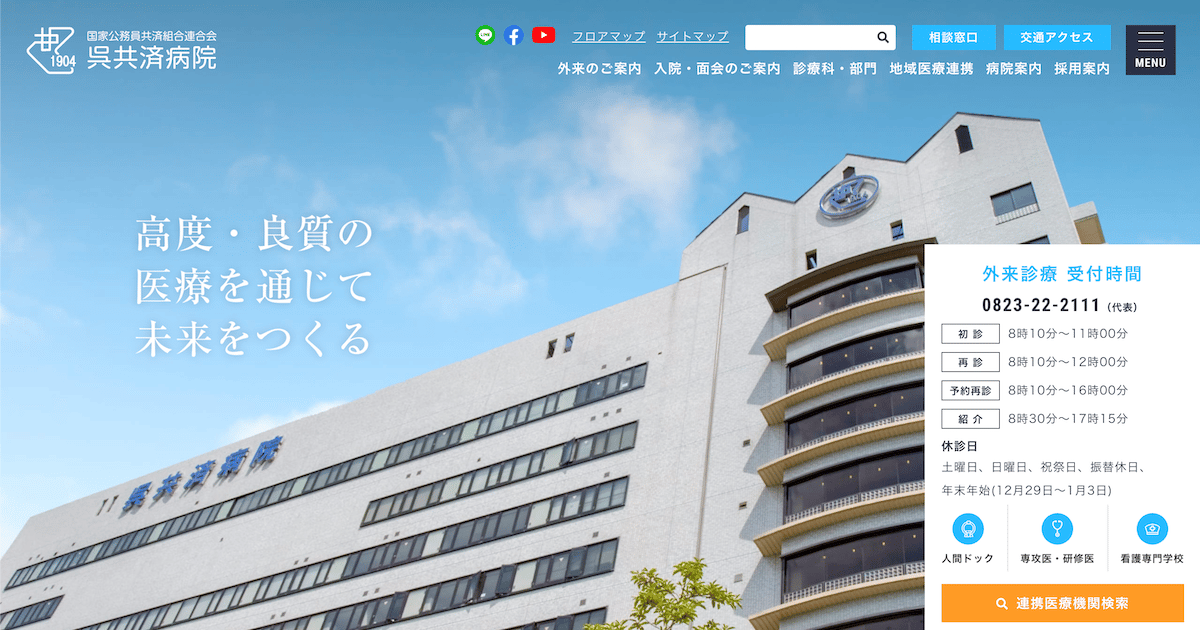 KKR呉共済病院呉駅から徒歩7分初診 8:10~11:00 / 再診 8:10~12:00 / 予約再診 8:10~16:00 / 紹介 8:20~16:00呉市で100年以上の歴史を持つ急性期総合病院。呼吸器・循環器などの専門診療に加え、CPAP外来で睡眠時無呼吸症候群の診療を行い、呉駅徒歩約7分・無料送迎運行で通院しやすい点が強みです。地域の高度医療を担い、専門スタッフによる丁寧な検査と継続的なフォロー体制を備えています。料金(税込) -詳細を見る公式サイトを見る