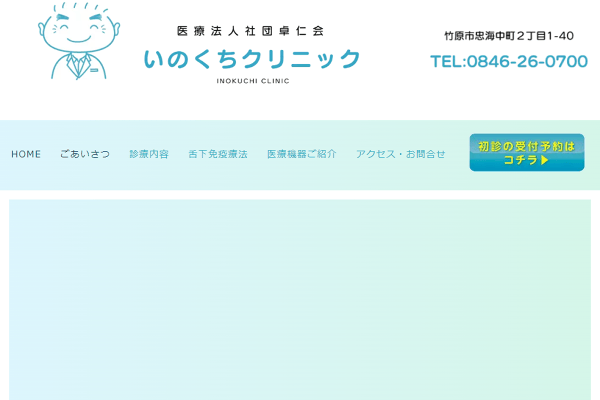 いのくちクリニック9:00~12:00 / 15:00~18:00(火曜午後は17:00~18:00)、土曜9:00~12:00、日曜休診耳鼻咽喉科の専門診療に加え、在宅医療や緩和ケアに注力する竹原市の地域密着クリニック。アレルギー性鼻炎や口腔内嚢胞へのレーザー治療と舌下免疫療法を提供し、地域の介護施設と連携し、24時間の急変対応にも協力しています。料金(税込) -詳細を見る公式サイトを見る