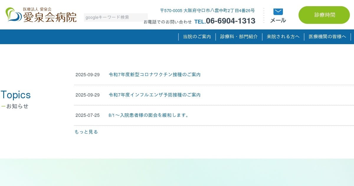 出典:藍整会 公式サイト藍整会守口駅から徒歩10分守口市にある150床のケアミックス病院。呼吸器内科を中心に内科・外科・リハビリが連携し、高齢者の在宅復帰支援や慢性疾患管理に注力。京阪守口市駅への無料送迎も行う地域密着の医療機関です。患者・家族に寄り添ったきめ細かいケアを提供します。公式サイトを見る