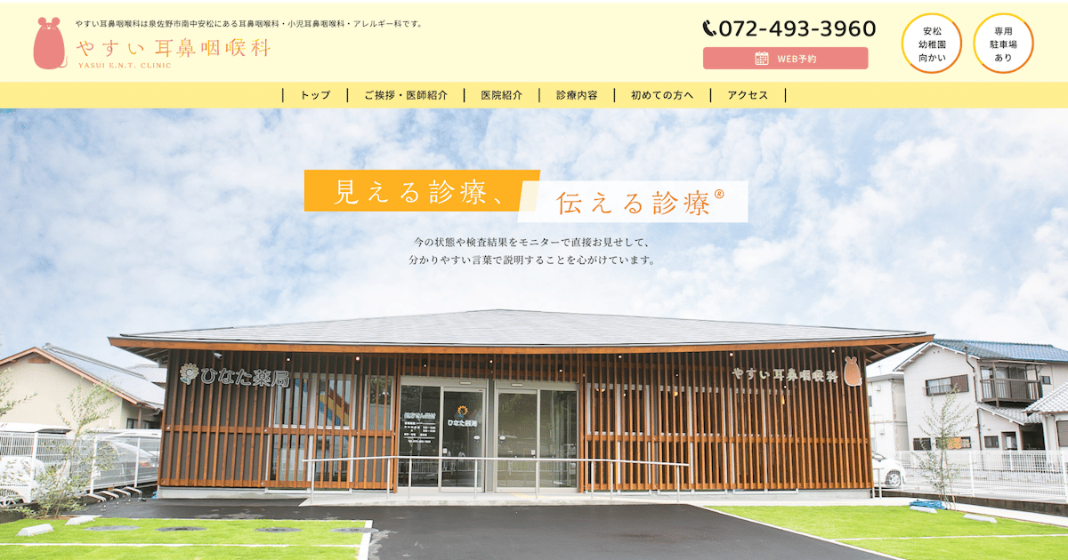 出典:やすい耳鼻咽喉科 公式サイトやすい耳鼻咽喉科月火木金 9:00~12:00、15:30~18:30 / 水土 9:00~12:00 / 休診: 水曜午後・第2木曜午後・土曜午後・日曜・祝日泉佐野市南中安松の地域密着耳鼻咽喉科。子どもから高齢者まで一人ひとりに丁寧に向き合い、モニターで検査結果を可視化して分かりやすく説明。駐車場完備で通院しやすい点が魅力です。公式サイトを見る