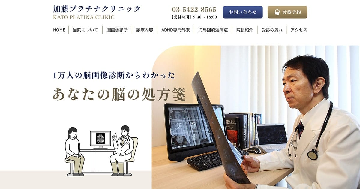 出典:加藤プラチナクリニック 公式サイト加藤プラチナクリニック目黒駅から徒歩9分09:30~18:00加藤式の国際特許を用いたMRI脳画像診断で、いびきや不眠の原因を脳機能から解析し、科学的根拠に基づく個別の改善プランとトレーニングを提供する点が特徴です。発達障害や認知症予防にも対応し、薬だけに頼らない脳の処方で年齢問わず個人の強みを引き出します。公式サイトを見る