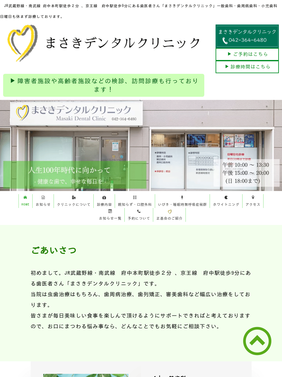 出典:まさきデンタルクリニック 公式サイトまさきデンタルクリニック府中本町駅から徒歩2分平日 10:00~13:30、15:00~20:00 / 日曜 10:00~13:30、15:00~18:00 / 休診:祝日府中本町駅徒歩2分で通院が便利。大学病院出身の口腔外科医が常勤し抜歯や外科処置に定評。いびき・睡眠時無呼吸症候群の相談に対応し、日曜も診療、平日は夜20時まで。駐車場3台完備で自費はカード支払い可。地域で外科治療と相談のしやすさが強みです。公式サイトを見る