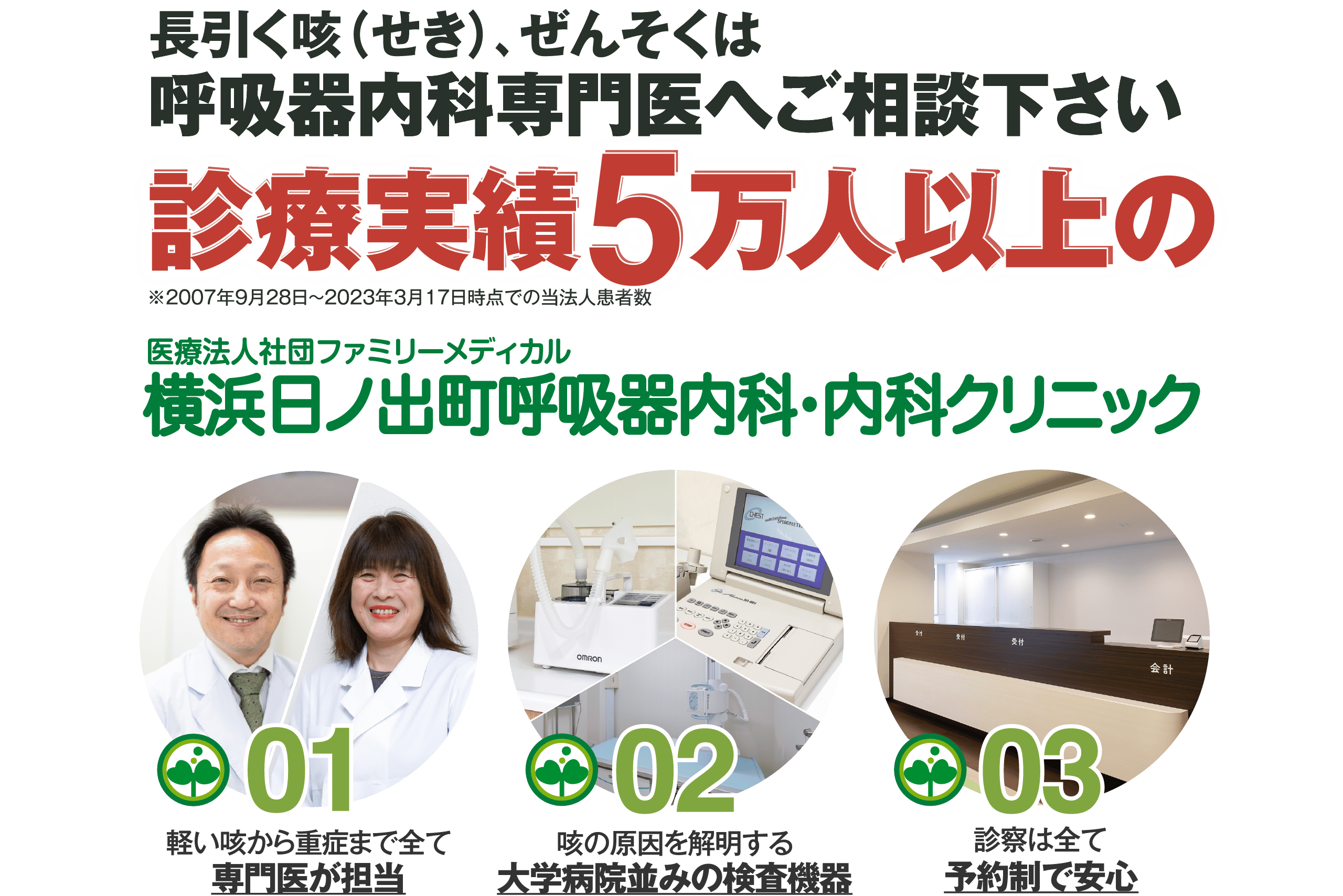 出典:横浜呼吸器内科クリニック 公式サイト横浜呼吸器内科クリニック日ノ出町駅から徒歩1分土日祝 14:30~17:30(受付は17:00まで)日ノ出町駅徒歩1分の呼吸器専門クリニック。喘息や長引く咳を専門的に診療し、大学病院並みの検査機器で原因を精査。専門医による禁煙治療や睡眠時無呼吸症候群の相談も受け付け、予約制で待ち時間に配慮し土日祝午後も診療しています。公式サイトを見る